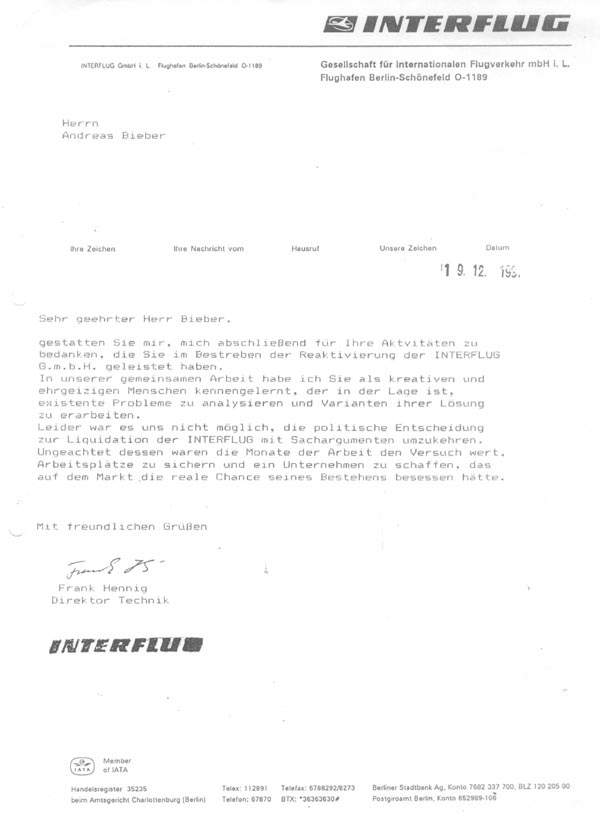 allow me to profoundly thank you for your activities (as consultant) in our endeavour to reactivate operations of INTERFLUG GERMAN AIRLINES GmbH.